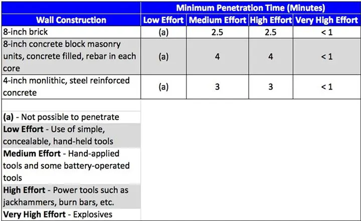 Whether or not a structure is part of a perimeter and the sensitivity of what exists inside the structure affect the types of materials used for the structure's exterior walls. Table 2 provides examples of various wall constructions and the amount of deterrence and delay each provides.