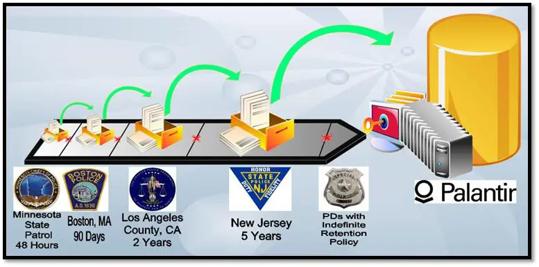 Speaking of Palantir, the Silicon Valley-based organization can also acquire every piece of data residing in servers of law enforcement agencies that are their clients, and keep it in their repository indefinitely, presumably for research purposes. In exemplification of how LPRS data can leap over databases of states that have different retention policies timewise, and just wind up hanging there ad infinitum, you can see the graph below.