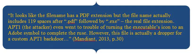 Spear phishing (malicious attachment) —Contextually meaningful messages with attachments like PDF (see the example below) or DOC files, which, once executed, create back doors that initiates stealthy line of connection between the infected computer and a control server(Information Warfare Monitor & Shadowserver Foundation, 2010).