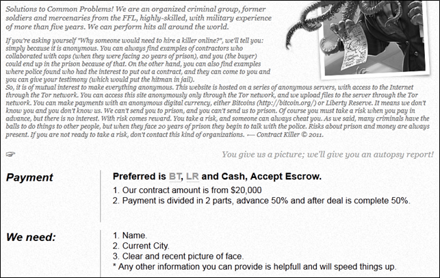 There are darker usages of the hidden servers. There are E-Black Markets all over this network that sell anything from meth to machine guns and services that range from assembling credit card data to assassinations ("you give us a picture; we'll give you an autopsy report!"). Most of the sites trade their goods with an e-currency called Bitcoins, an anonymous electronic commodity that can purchase almost anything.