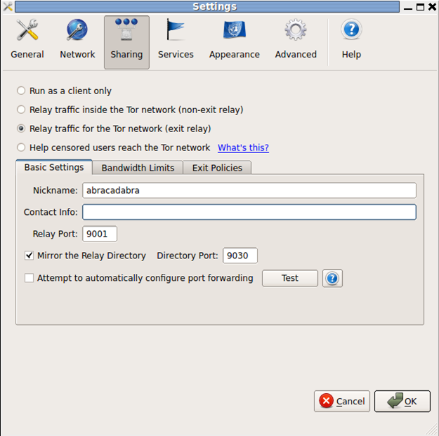 We can very easily configure a Tor relay with a Vidalia graphical user interface by clicking on Settings –> Sharing --> "Relay traffic for the Tor network (exit relay)". This can be seen in the picture below: