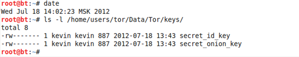 The commands presented in the picture were issued a few moments after the Tor relay had been configured and started. We can see that the current date is a few minutes after the creation time of the private keys, which indicates that those two keys were recently created. Those two keys are critical to the operation of our relay, since they are used for encryption/decryption of the traffic passing through our relay. If someone could get their hands on those two private keys, then he could decrypt all the traffic that passes through our relay, which breaks Tor's anonymity.