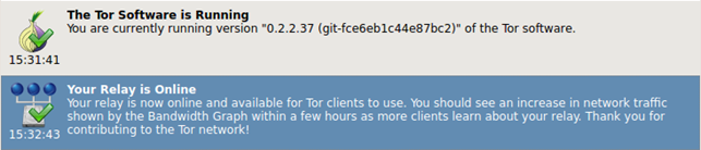 In the Message Log we can see the picture attached below; it says that Tor and Relay are running fine, which enhances our belief that everything is working fine.