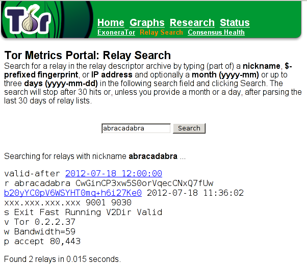 We searched for the search string "abracadabra", which is the nickname of our relay, so it is up and running. I've masked my external IP with xxx.xxx.xxx.xxx, but the address is there, so this is another confirmation that your relay isn't anonymous and its external IP is visible. The picture above also shows us what ports the relay will let through (80 and 443), the available bandwidth and the version of Tor running, plus some weird looking string "CwGinCP3xw5S0orVqecCNxQ7fUw", which I'm not sure what it means.