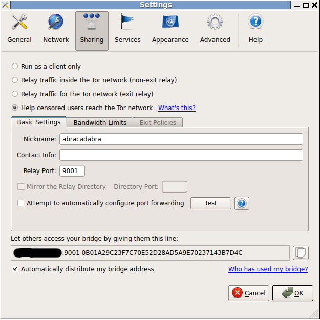 We can see that the configuration is practically the same as with Tor relays. The only difference in Vidalia is the presence of the last setting "Let others access your bridge by giving them this line", which specifies the IP, port and fingerprint of our bridge server. There's also an option to "Automatically distribute our bridge address", which specifies that Tor will automatically use this bridge descriptor and send it to clients wishing to connect to a bridge. We can of course disable this feature and only send the string to our friends, so only they will be able to connect through our bridge.