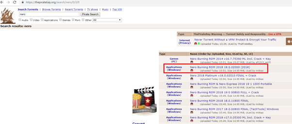 Nero is the most famous program for making optical authoring software and is a leader in the market. So we’ll search for Nero on The Pirate Bay: