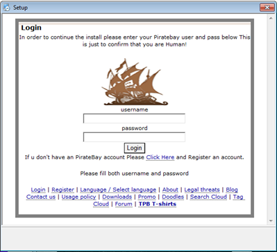 It is very suspicious that a Nero installer asks for the credentials of a Pirate Bay account, pretending to be an anti-bot check. The reality is that it is a phishing program developed to steal user credentials. Indeed, uploading the file on VirusTotal platform, we have the following results:
