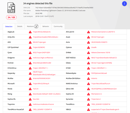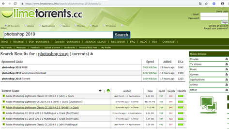 Another widely used program is Adobe Photoshop. Created in 1988, this software has become the de facto industry standard for image editing and post-processing. In fact, everyone who wants to share image processing work uses the file formats defined by Adobe. For this reason, it is another attractive means to spread malware, so we decided to search for Photoshop on LimeTorrents: