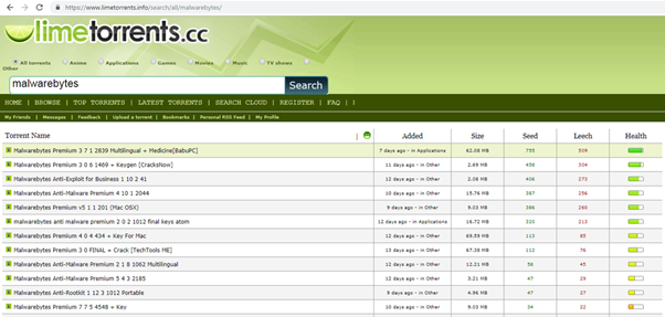 Another popular software downloaded by many users is, curiously, the popular antivirus software Malwarebytes. It has a free version that is available for download on the vendor’s official site, but it is limited in some important functionalities such as real-time protection. However, we found a cracked version of Malwarebytes Premium online; it promises to implement all the functionalities included in the paid version. So we searched for it on LimeTorrents, obtaining a huge amount of results: