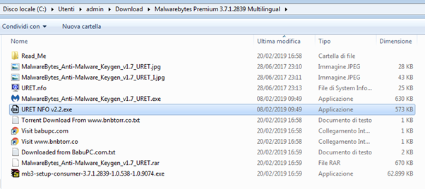 We’ve chosen the first one corresponding to one of the latest Malwarebytes versions, which has an excellent Health score due to the high number of seeds. After downloading it, we are in front of a series of files — including the installation executable, some “README” text files and the key generator, which will be able to instantiate a valid anti-malware license.
