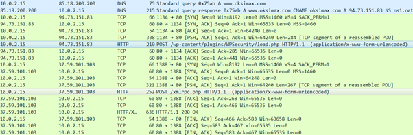 Obviously, the bot must determine if the target site is WordPress-based; this can be done using a simple HTTP GET request towards “/wp-login.php,” the canonical WordPress login form path. When it finds the right target, it starts to brute-force some pages related to website login such as “xmlrpc.php” or “WPSecurity/load.php.” It does this using POST requests which include credentials retrieved from a classic wordlist (among them: “admin,” “root” and so on).
