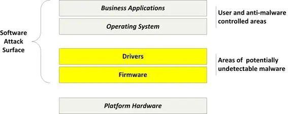 For our purposes, a platform consists of two software attack surfaces (Chapter 5): firmware/drivers/boot loader and OS/applications. See Figure 8-1. Organizations can protect the high-level OS and applications with anti-malware (AM) solutions and attack surface reduction processes. However, the firmware, boot loader, and device driver layers are traditionally unprotected. Although AM vendors might claim to help prevent attacks against these software surfaces, evil maid attacks and Alureon variations are examples of how attackers can bypass anything other than a protected boot path. The UEFI, supported by a TPM, provides mechanisms to stop boot path threats from taking control.