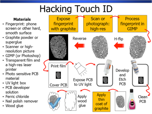 Fake fingerprint to bypass fingerprint scanner for iPhone is made by a German group of hackers "Chaos Computer Club". They demonstrated to create a fake fingerprint from a photograph of the user's finger. That can be easily obtained from the reflecting touch screen of the mobile device.