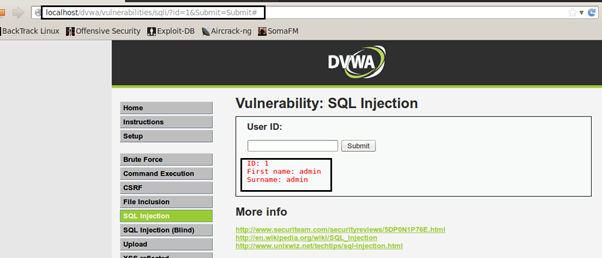 Identifying the SQL injection is the key step, and it takes a lot of skill and experience to identify the injection point. By analyzing the application properly,the possible injection points can be identified. Like in the screenshot shown below, the USER ID field could be vulnerable to SQL injection. It takes an integer as input and displays the First Name and Surname associated with the User ID provided.