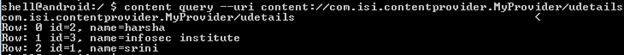 Content –query –uri content://com.isi.contentprovider.MyProvider/udetails