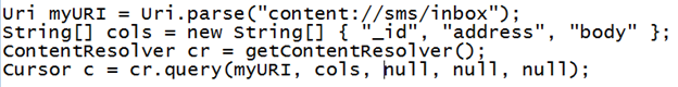 We can even write a malicious app to query the data from its content provider. Following is the code snippet to query the inbox from a mobile device.