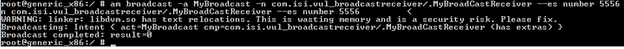 am broadcast -a MyBroadcast -n com.isi.vul_broadcastreceiver/.MyBroadCastReceiver --es number 5556.
