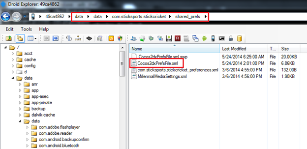 - Now, delete the Cocos2dxPrefsFile.xml file from the Android device using Droid Explorer.