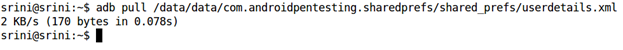 As we can see in the above figure, there is a folder named "shared_prefs". This gets created when an app is using shared preferences in it. We can change the directory to shared_prefs and use the "cat" command to look at the contents of this application right away.