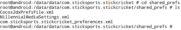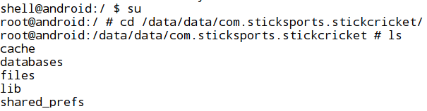 We have opened an adb shell on the device and then elevated the privileges using the "su" command. Every application installed on an Android device will have all its application-specific data inside "/data/data" directory. So, we have navigated to /data/data/com.sticksports.stickcricket/.