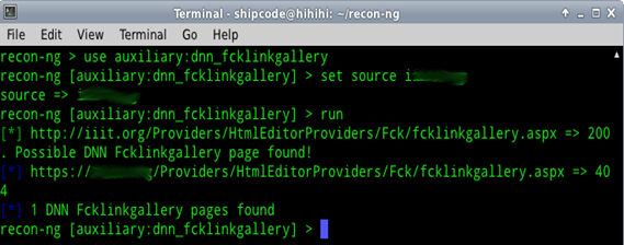 This is the module that I contributed and was recently added by the main author of the Recon-ng Framework to the main repository. This auxiliary module checks for a Dot Net Nuke (DNN) fcklinkgallery.aspx page which is possibly vulnerable to Remote File Upload and allows other viewers to browse through the files that were uploaded to the web server. In most cases, you can see ASP backdoor shells and text files uploaded by some exploiters. This is an old vulnerability but there are still a lot of web administrators that haven't upgraded their DNN version and patched this vulnerability yet on their website.