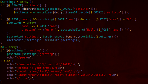 1. The POST "name" parameter is filtered out by the PHP escapeshellarg() function (which mainly will escape single quotes to prevent injecting malicious commands) and then it is stored in the Array->greeting field to finally create a cookie encrypted with this value.