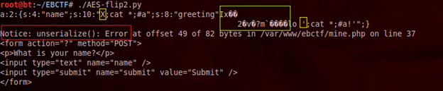 After sending above string, voila!!!, unserialize() does not complain about the garbage received and our shell command is executed successfully!!!!