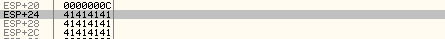 The stack address at [esp+24] contains exactly 12 characters of the input key. The loop counter is used to iterate over certain values of the input key, therefore we're actually accessing values from [esp+24] to [esp+2F]. If we enter the key that contains exactly 12 A's into the Key 2 input field, the stack will look like the picture below: