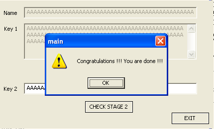 First, the test instruction on register eax is used to set the right flags in the eflags register. If the eax register contains a value 0, the first jump is taken, giving us the failure message. But if the eax contains a value 1, the second jump is taken, which displays the congratulations window, which we can see in the picture below: