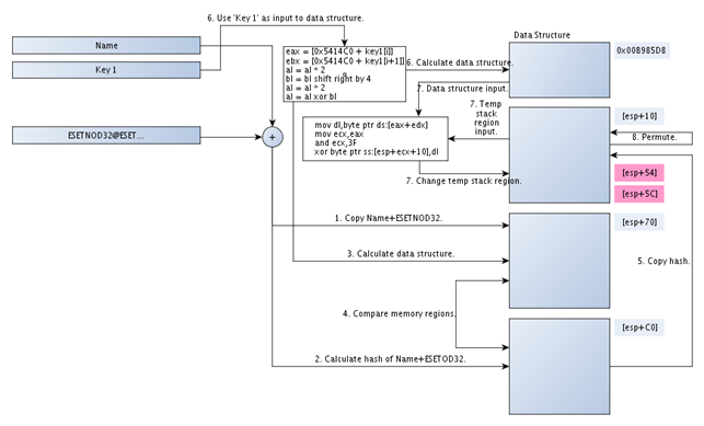 The [esp+C0] points to the address 0x0012EB08, which contains the whirlpool hash of the Name value plus ESETNOD32@ string, like this: