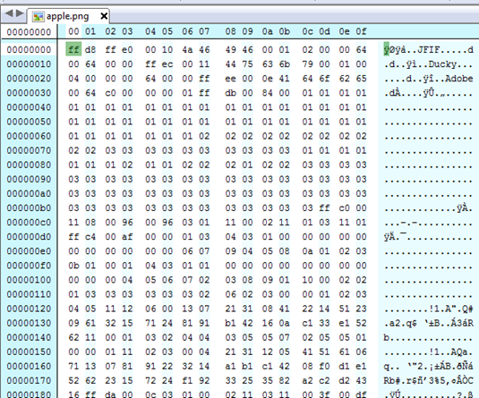 - Select any secret file (for example apple.png). Here is the HEX representation of the apple.png file: