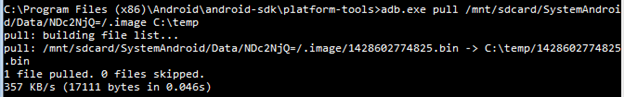 - The next thing is to pull out this encrypted file to the local machine. I used the adb pull command for this purpose. As seen below, the file is stored with a .bin extension.