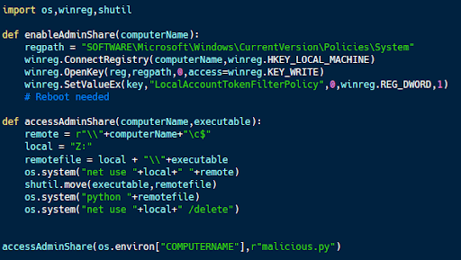 The code sample above (available on Github) uses Python to enable admin shares on a computer and also to remotely access available admin shares. The program opens a remote admin share, copies over an executable, runs that executable and then deletes it from the remote drive.