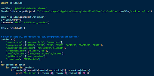 By querying this database, it’s possible to locate and extract these authentication cookies. In this case, the script iterates through all of the records in the database and looks for cookies associated with commonly used services like Amazon, Google, Microsoft, Facebook and Github. The particular cookies that it looks for (included in the dictionary named cookies) contain authentication information for that service.
