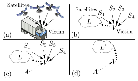In the attack scenario, the victim uses a GPS-based localization system and is synchronized to the legitimate satellites. The attacker starts sending own spoofing and jamming signals forcing the victim to synchronize to the attacker's signals.