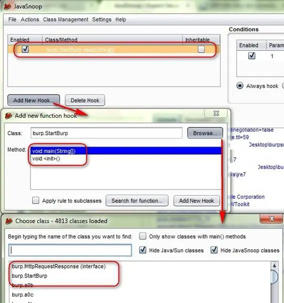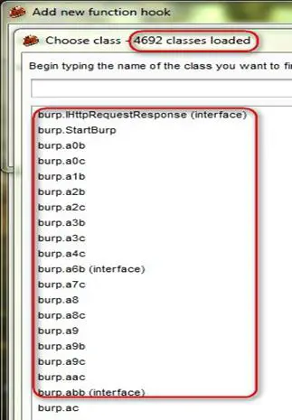 The screenshot below shows the huge list of BURP classes loaded into the JavaSnoop tool. This makes it difficult to identify the correct class and method for hookingand intercepting the traffic.