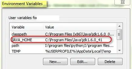 JAVA_HOME: Path pointing to JDK 1.6 folder as shown below: