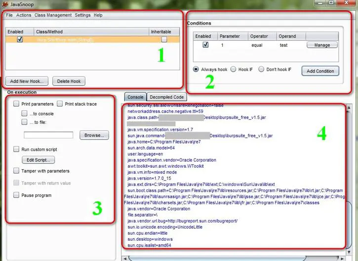 The main interface of the JavaSnoop tool is divided into four parts as shown in the diagram below.