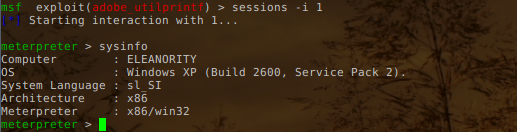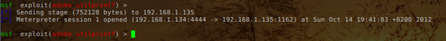 When we open the malicious PDF document in a vulnerable Adobe PDF Reader, a new meterpreter session should be opened as can be seen on the picture below: