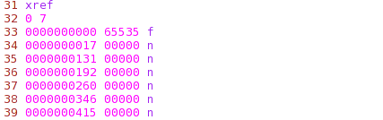 In the picture above we also have one encrypted stream, which is non-recognizable right now. In line 29 that stream is terminated by the endstream and on line 30 with endobj keywords. What follows is the Xref table, which we can see in the following picture: