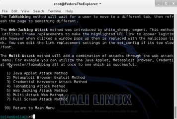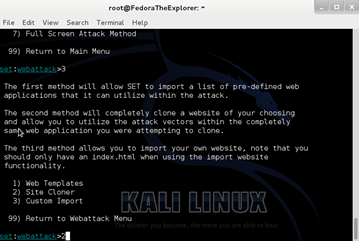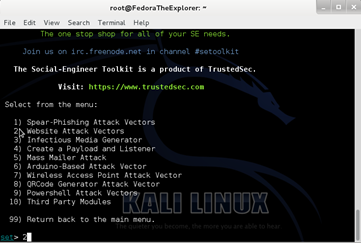 Then, type 2 for Website Attack Vectors and press Enter