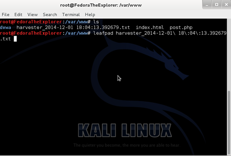 Afterwards, head over to /var/www through a terminal and type "ls" to verify that indeed there is a text file with the harvested information. Finally, open the text document with a text editor, like leafpad.