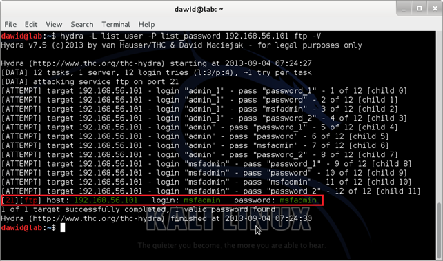 dawid@lab:~$ hydra -L list_user -P list_password 192.168.56.101 ftp -V