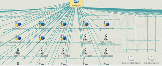 Right click on the domain name and then select "All Transform". By choosing this option you will get all the information weather it's an email ID, DNS related to Domain, Domain owner details, file and documents from details, telephone numbers, etc. Wait for a few moments to complete the transform and you will get the desired result.
