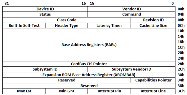 Figure 1 shows the general layout of the header portion of the PCI configuration registers in a PCI device. This particular configuration is called PCI configuration Type 0. It is used for a PCI device which is not a PCI bridge. A PCI bridge connects two different PCI buses. PCI devices— such as an Ethernet card or video card—are not a PCI bridge. Therefore, I'm only focusing on PCI configuration Type 0.