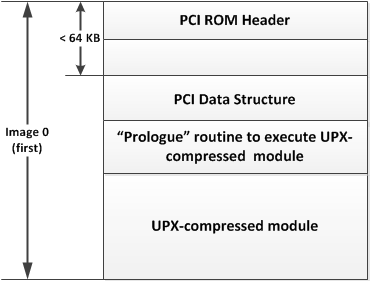 Figure 6 doesn't show that you should minimize the distance between the PCI ROM header and PCI data structure. However, you should be sure to minimize that distance because you want to maximize the space for the UPX-compressed module. The "prologue" section contains the routine to pass execution into the UPX-compressed module. Theoretically you could innovate at this point and do whatever you like, just make sure you don't create a code that overwrites important part of the PCI Expansion ROM, and make sure the final execution of the PCI expansion ROM returns to the motherboard BIOS with a "far" return.