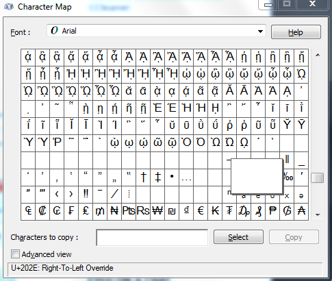 For example, let's create a file with Name TestingRTLO[U+202E]xcod.txt. "U+202E" can be copied and pasted from the above character map present in Windows. To make sure something is present in the character, do the following steps: